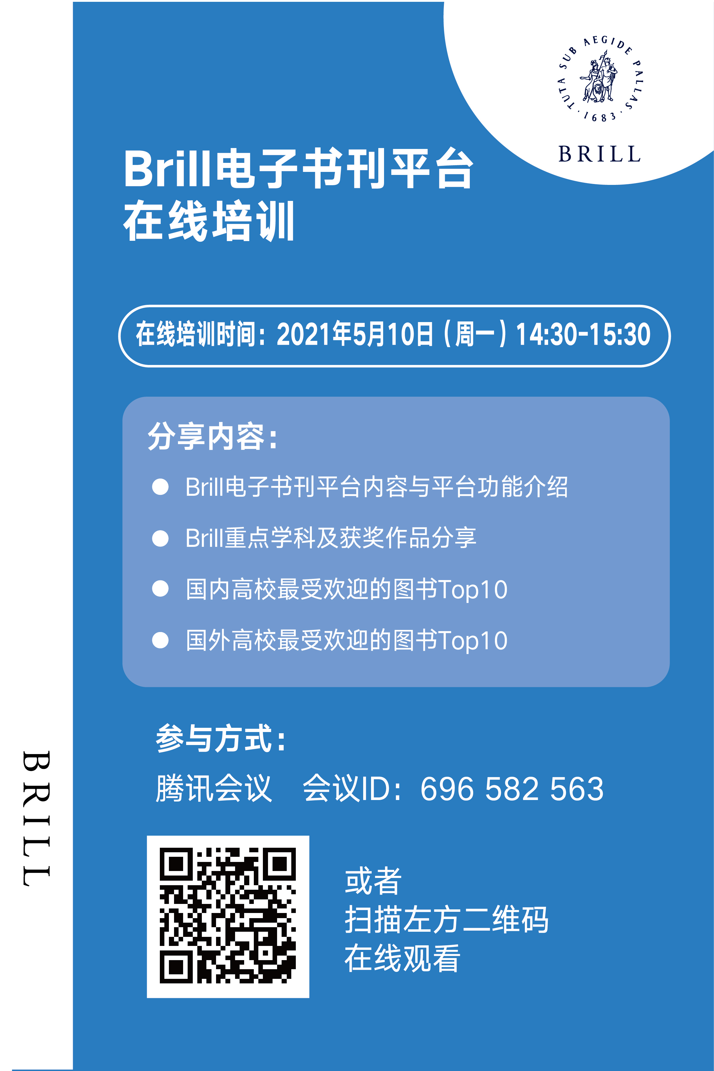 中山大学图书馆 > Brill电子书刊平台在线培训 Brill电子书刊平台在线培训 发布人:珠海校区-刘利 发布日期:2021-04-29 活动时间 2021年05月10日 14:30 - 2021年05月10日 15:30 培训内容: Brill电子书刊平台内容与平台功能介绍 Brill重点学科及获奖作品分享 国内高校最受欢迎的图书Top10 国外高校最受欢迎的图书Top10 参与方式: 腾讯会议 会议ID:696 582 563 或者扫描下方二维码: 宣传海报: 分享