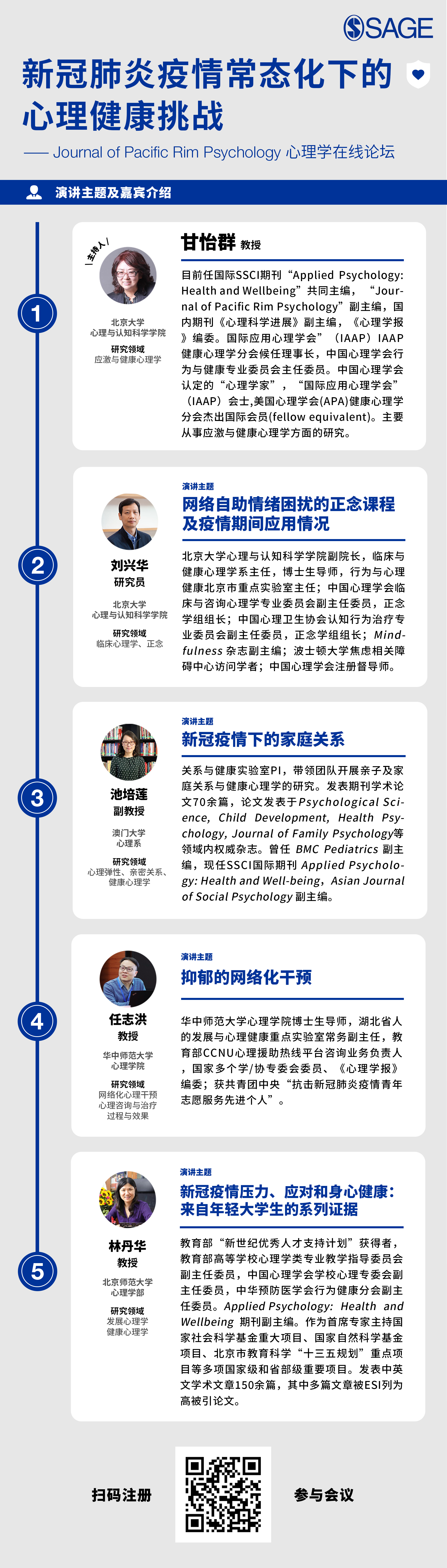 在这个特殊时期,中国心理学领域的专家学者们开展了哪些深入的课题研究,希望帮助大家应对新冠疫情常态化下的心理健康挑战?SAGE特邀5位心理学领域的专家学者齐聚一堂,结合当下的实际情况,从网络影响、家庭关系以及年轻人的心身健康等研究方向为大家呈现一场心理学研究盛会,诚邀您的参与!
