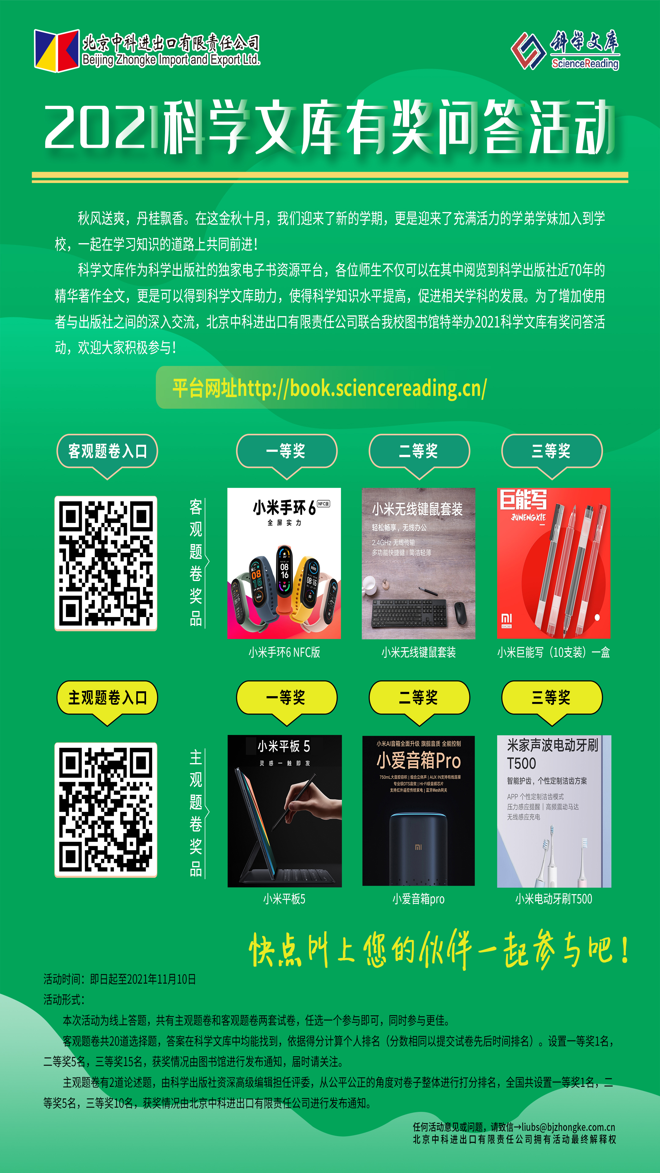 中山大学图书馆 > 欢迎参加2021科学文库有奖问答活动 欢迎参加2021科学文库有奖问答活动 发布人:公共服务部-陈璇 发布日期:2021-10-18 活动时间 2021年10月18日 00:00 - 2021年11月10日 12:00 活动形式 线上答题,分为客观题卷和主观题卷两套试卷。 客观题卷共20道选择题,全校共设置一等奖(小米手环6 NFC版)1名,二等奖(小米无线键鼠套装)5名,三等奖(小米巨能写(10支装)一盒)15名。 主观题卷共2道论述题,全国共设置一等奖(小米平板5)1名,二等奖(小爱音箱pro)5名,三等奖(小米电动牙刷T500)10名。 分享