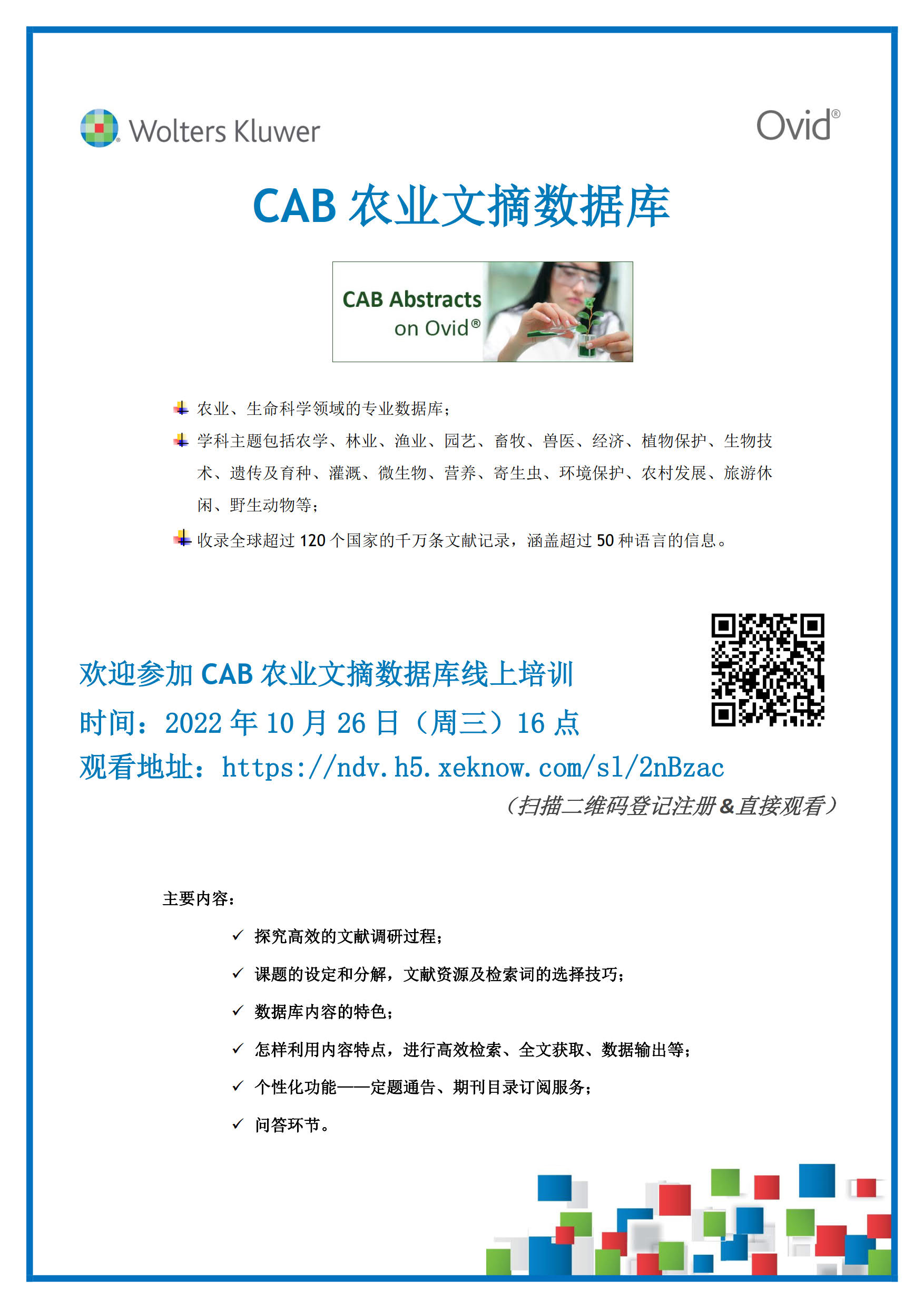 中山大学图书馆 > 欢迎参加CAB农业文摘数据库线上培训 欢迎参加CAB农业文摘数据库线上培训 发布人:公共服务部-陈璇 发布日期:2022-10-18 活动时间 2022年10月26日 16:00 - 2022年10月26日 17:00 活动地址 https://ndv.h5.xeknow.com/sl/2nBzac 分享