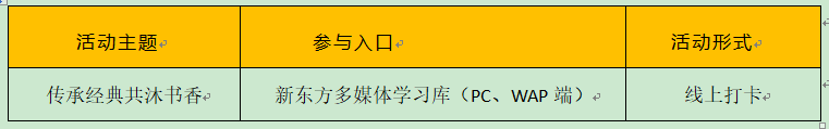 4月23日为“世界读书日”,四月即“读书月”,为鼓励读者品读文学经典、鉴赏经典诗歌,探寻文化之根,新东方在线特别为大家策划名为“传承经典共沐书香”的读书月活动,使读者了解图书馆资源,看经典、共打卡,抽大奖。