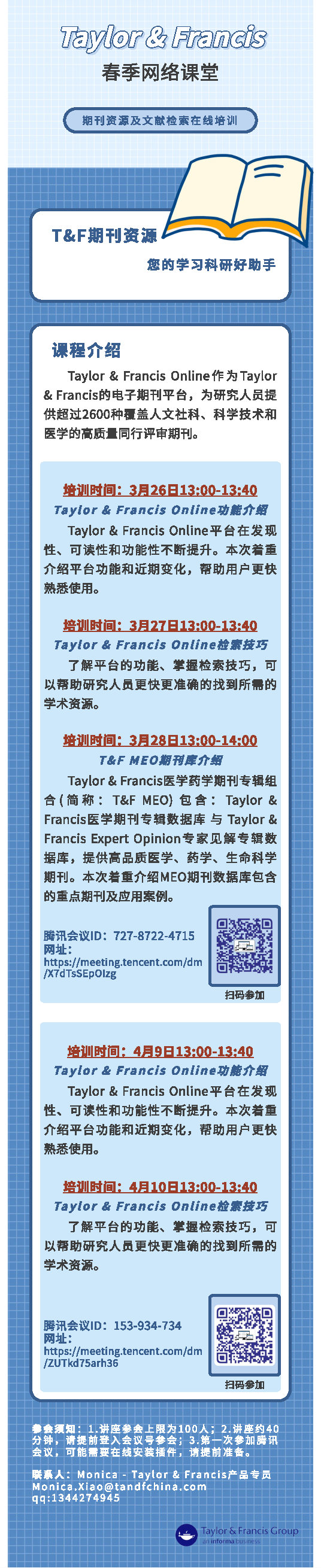中山大学图书馆 > Taylor & Francis2024春季网络课堂——期刊资源及文献检索在线培训 Taylor & Francis2024春季网络课堂——期刊资源及文献检索在线培训 发布人:公共服务部-颜丽君 发布日期:2024-03-20 活动时间 2024年03月26日 13:00 - 2024年04月10日 13:40 分享