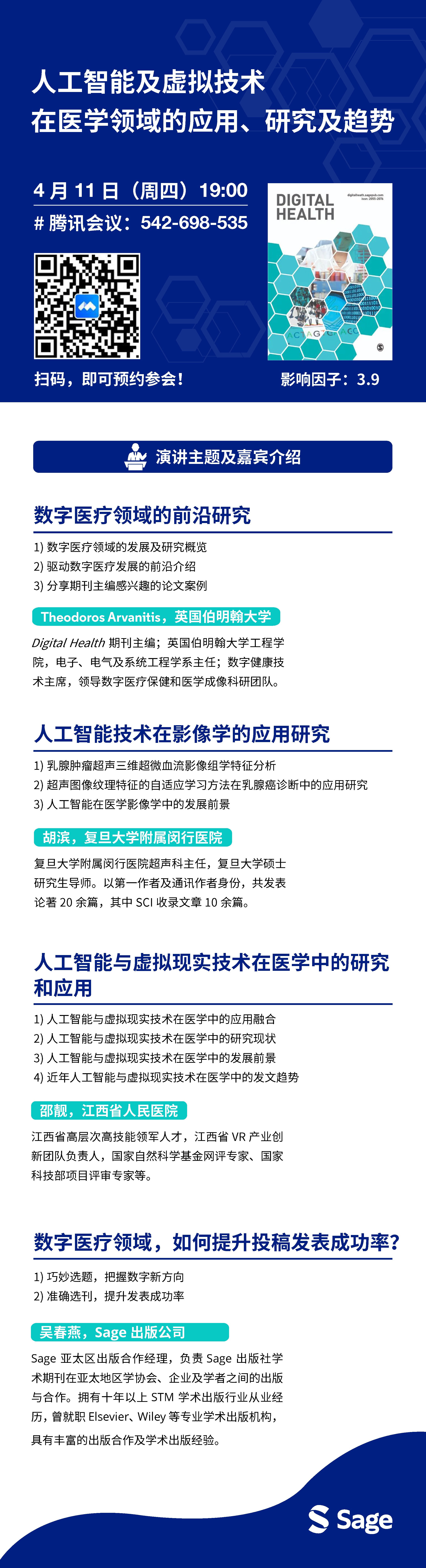中山大学图书馆 > 欢迎参加SAGE数据库“人工智能及虚拟技术在医学领域的应用、研究及趋势”讲座 欢迎参加SAGE数据库“人工智能及虚拟技术在医学领域的应用、研究及趋势”讲座 发布人:珠海校区图书馆-刘兰娜 发布日期:2024-04-02 活动时间 2024年04月11日 19:00 - 2024年04月11日 20:30 活动地点 https://meeting.tencent.com/dm/YM3R64z5LDtf 上述资料由SAGE数据库公司提供 分享