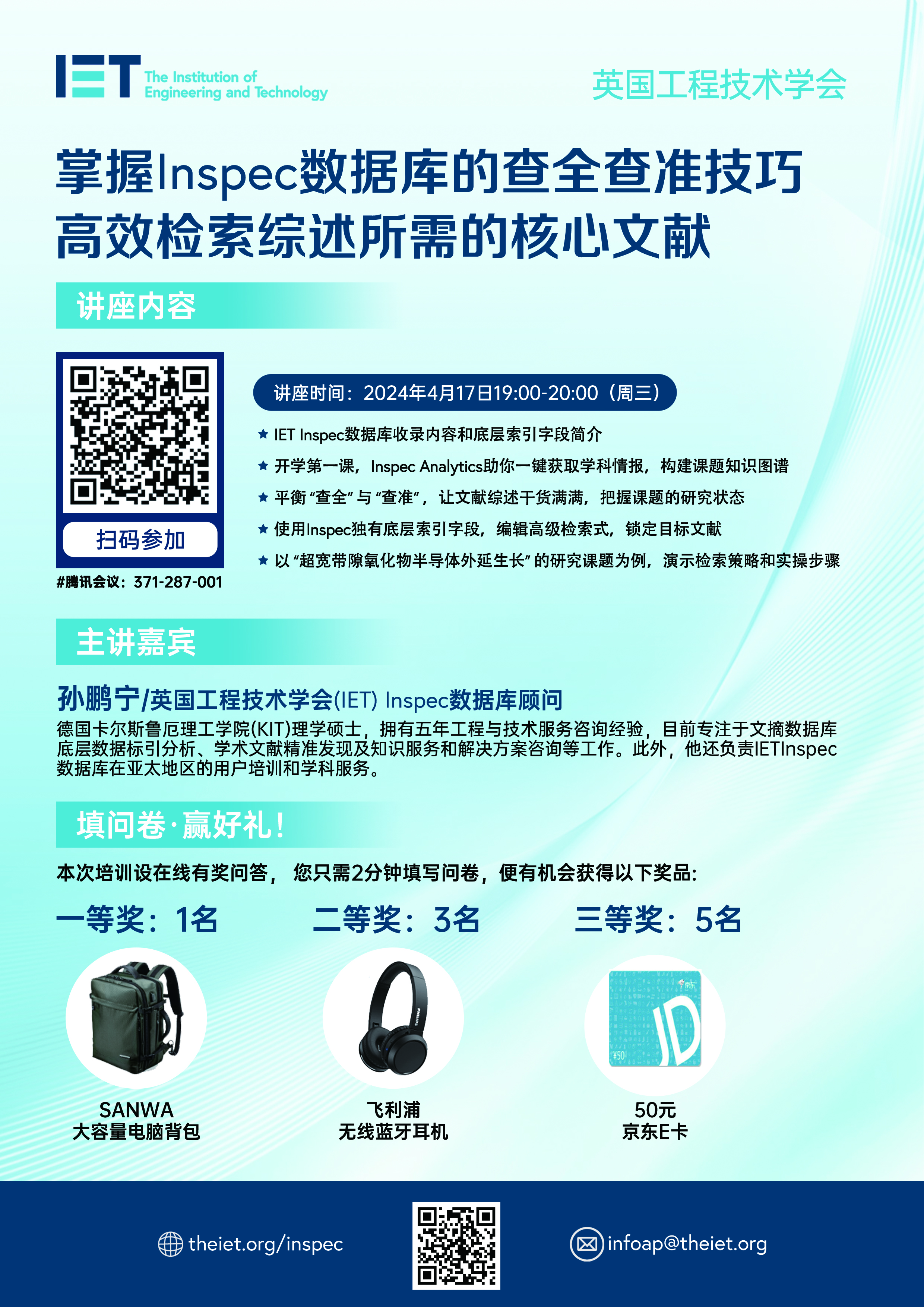 中山大学图书馆 > 在线讲座|掌握Inspec数据库的查全查准技巧 高效检索综述所需的核心文献 在线讲座|掌握Inspec数据库的查全查准技巧 高效检索综述所需的核心文献 发布人:公共服务部-何雪英 发布日期:2024-04-07 活动时间 2024年04月17日 19:00 - 2024年04月17日 20:00 分享