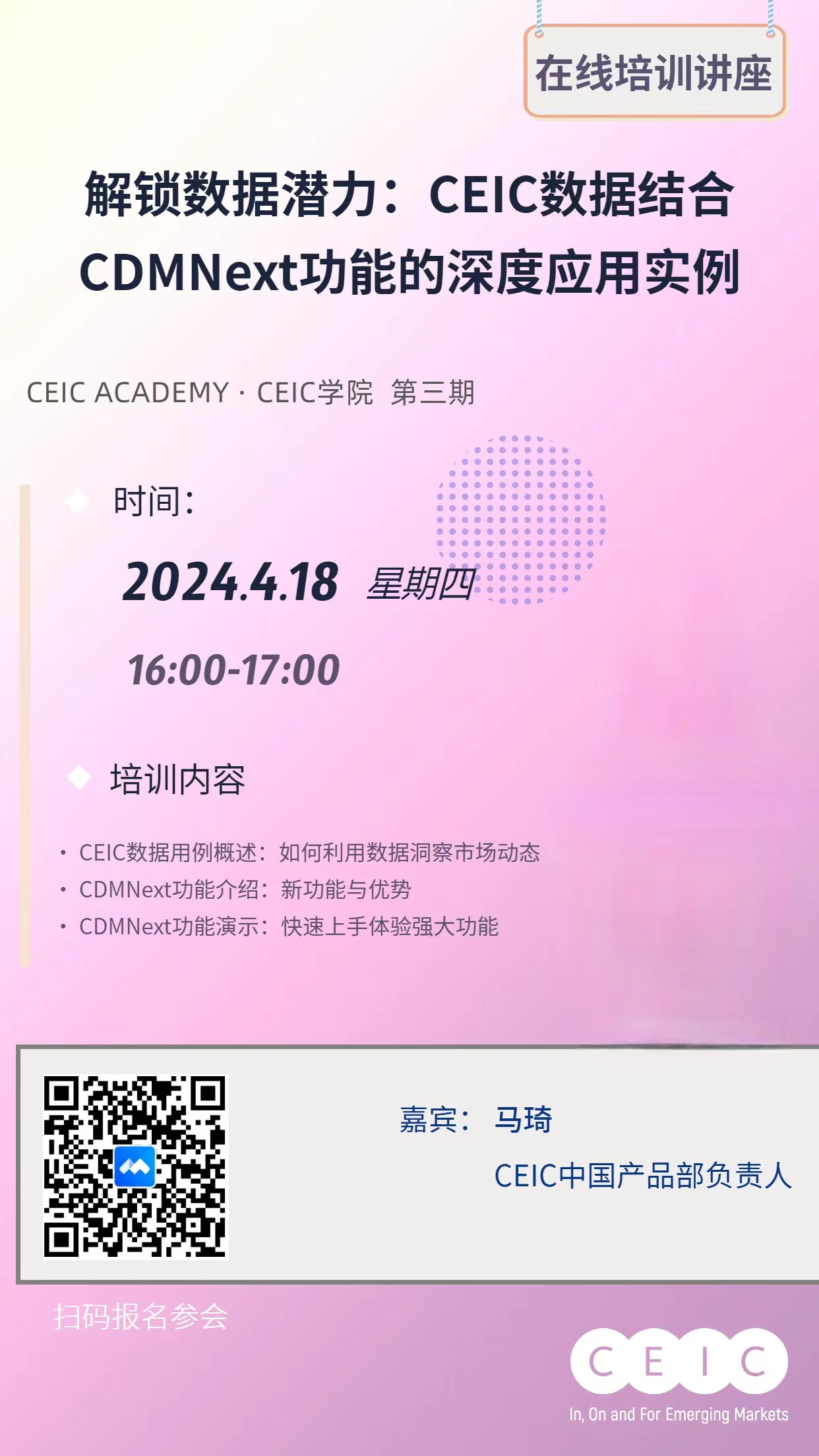 中山大学图书馆 > 欢迎参加CEIC数据库在线培训讲座 欢迎参加CEIC数据库在线培训讲座 发布人:公共服务部-周佳宁 发布日期:2024-04-17 活动时间 2024年04月18日 16:00 - 2024年04月18日 17:00 分享