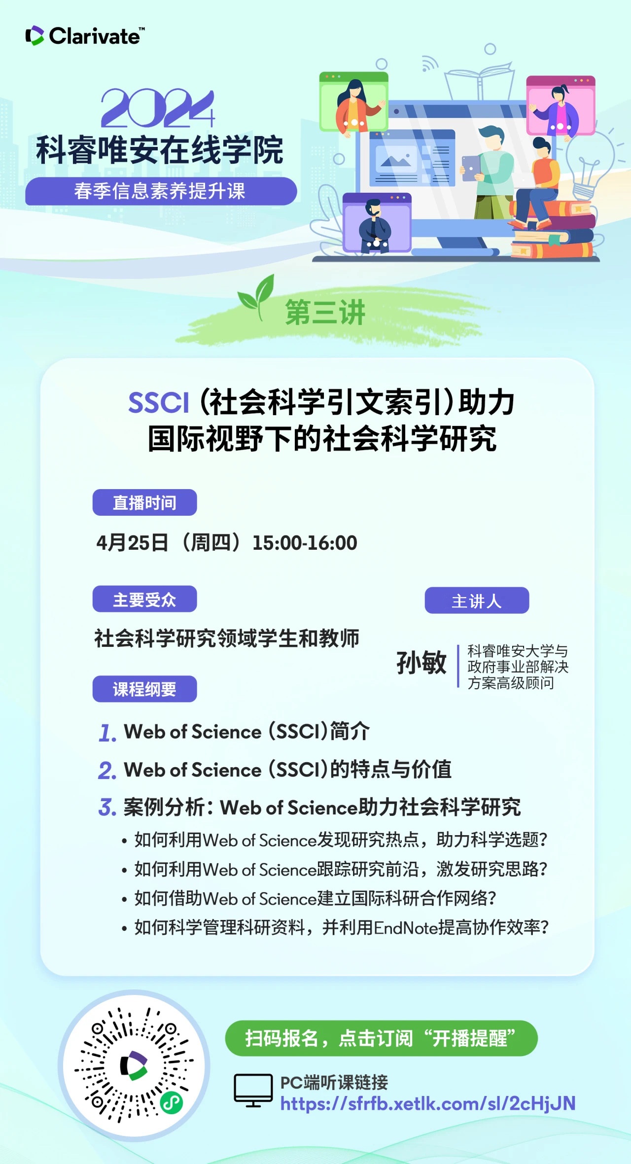 中山大学图书馆 > 直播课程 | SSCI(社会科学引文索引)助力国际视野下的社会科学研究 直播课程 | SSCI(社会科学引文索引)助力国际视野下的社会科学研究 发布人:公共服务部-何雪英 发布日期:2024-04-24 活动时间 2024年04月25日 15:00 - 2024年04月25日 16:00 活动地点 电脑端:https://sfrfb.xetlk.com/sl/2cHjJN,手机端:扫描下方海报二维码 分享