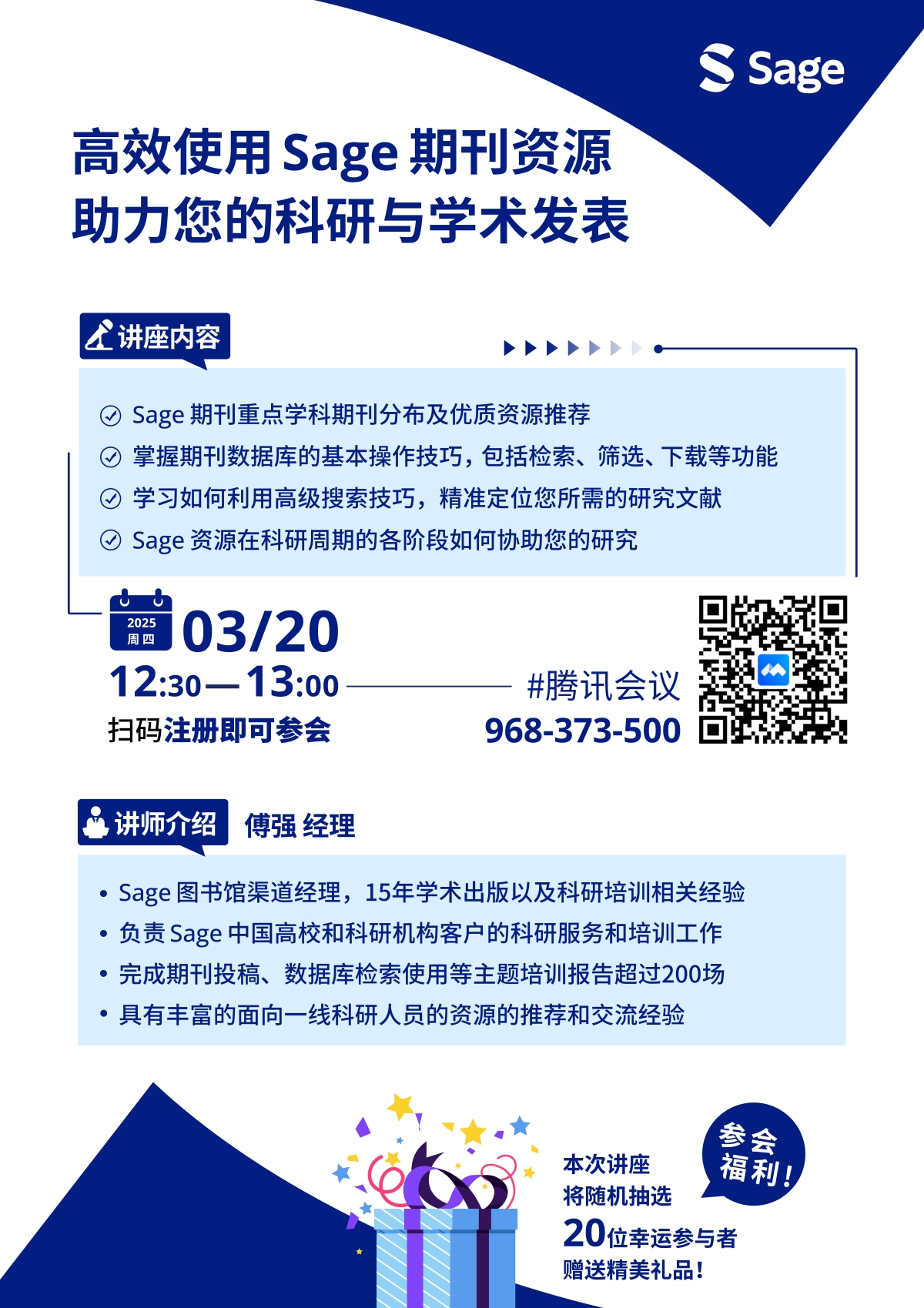 中山大学图书馆 > 欢迎参加SAGE期刊数据库线上讲座 欢迎参加SAGE期刊数据库线上讲座 发布人:珠海校区图书馆-刘兰娜 发布日期:2025-03-17 活动时间 2025年03月20日 12:30 - 2025年03月20日 13:00 活动地点 https://meeting.tencent.com/dm/zzGLyytF7ZI2 上述资料由SAGE数据库公司提供 分享