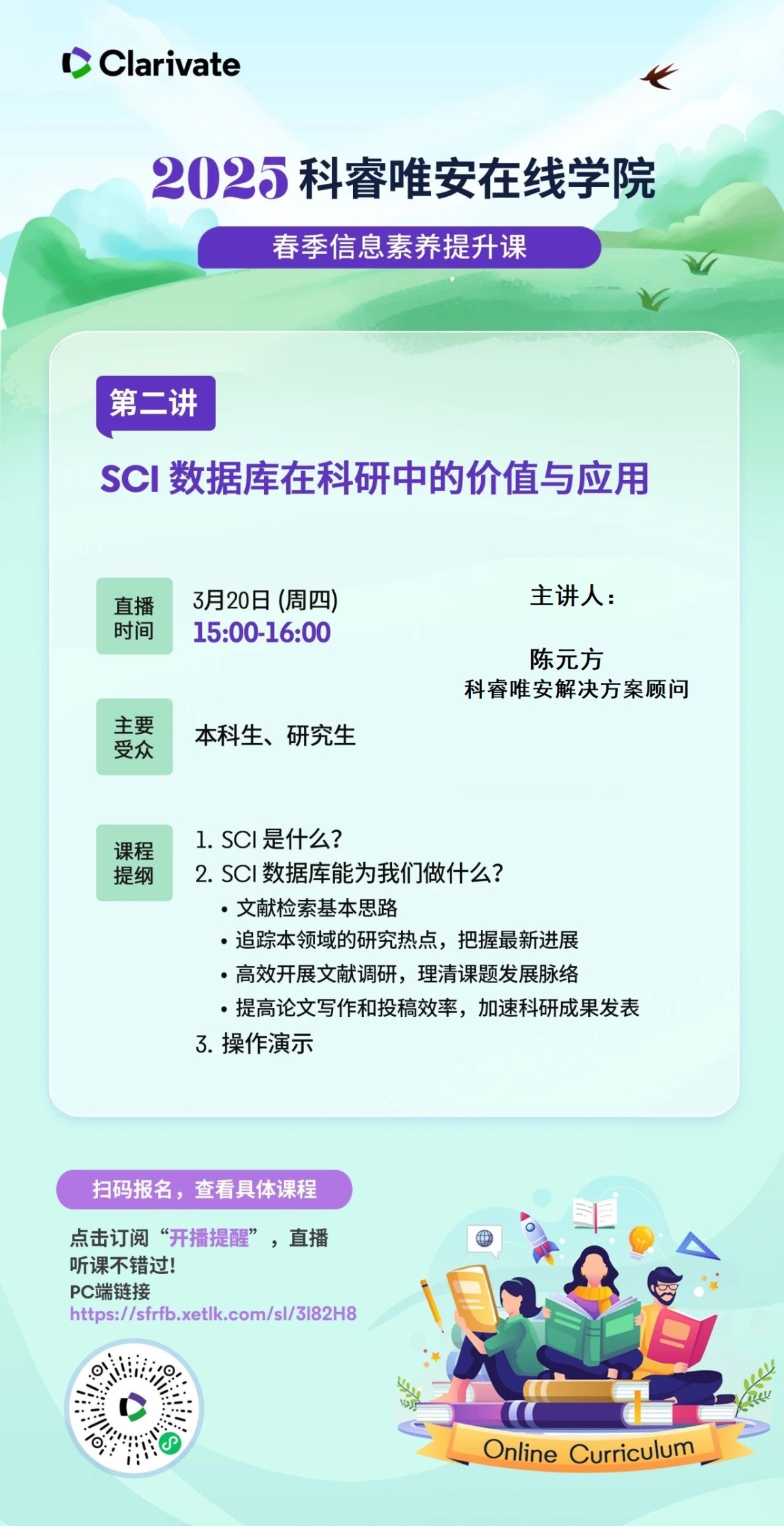 中山大学图书馆 > 线上培训|SCI数据库在科研中的价值与应用 线上培训|SCI数据库在科研中的价值与应用 发布人:公共服务部-何雪英 发布日期:2025-03-18 活动时间 2025年03月20日 15:00 - 2025年03月20日 16:00 活动地点 电脑端:https://sfrfb.xetlk.com/sl/3l82H8,手机端:扫描图中二维码 分享