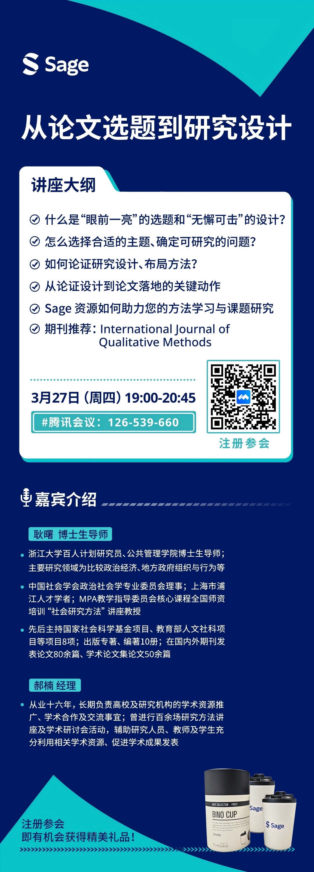 中山大学图书馆 > 在线讲座|SAGE资源助力论文选题及研究设计 在线讲座|SAGE资源助力论文选题及研究设计 发布人:珠海校区图书馆-刘兰娜 发布日期:2025-03-20 活动时间 2025年03月27日 19:00 - 2025年03月27日 20:45 活动地点 https://meeting.tencent.com/dw/bsqZqSj11JUP 上述资料由SAGE数据库公司提供 分享