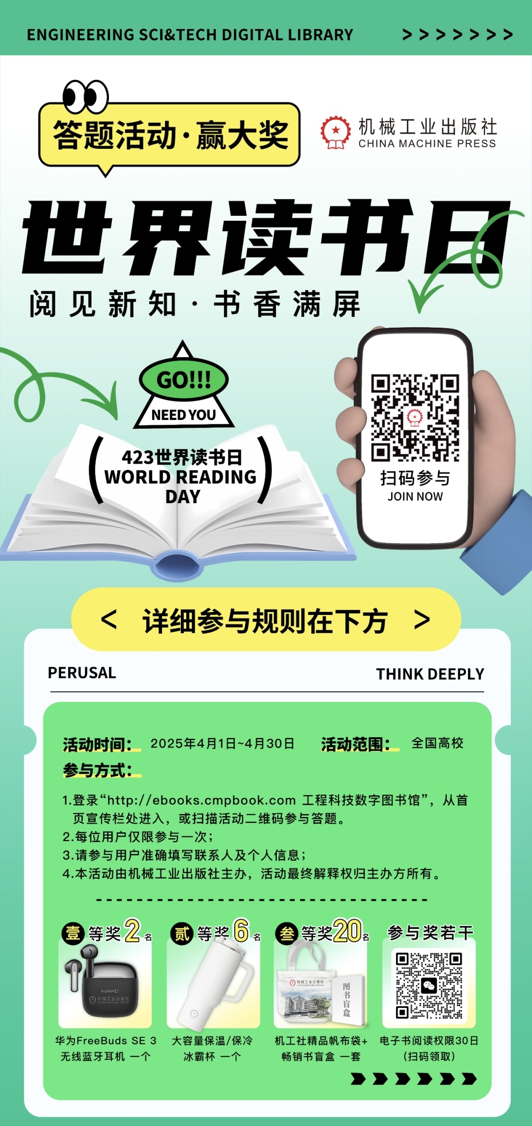 中山大学图书馆 > 欢迎参加工程科技数字图书馆世界读书日答题活动 欢迎参加工程科技数字图书馆世界读书日答题活动 发布人:深圳校区-袁方 发布日期:2025-03-28 活动时间 2025年04月01日 00:00 - 2025年04月30日 00:00 活动地点 http://ebooks.cmpbook.com/index 分享
